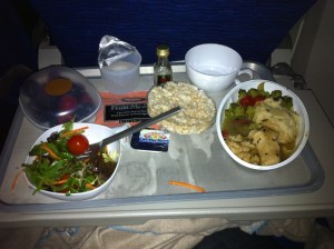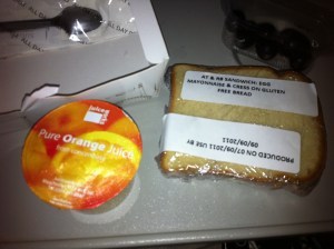 The ‘snack’ meal was the same on all flights, egg salad sandwich, with a lot of fresh dill and no mayonaisse on the bread. The bread was a great looking white bread, but like most GF bread it really needed the extra moisture of some sauce.